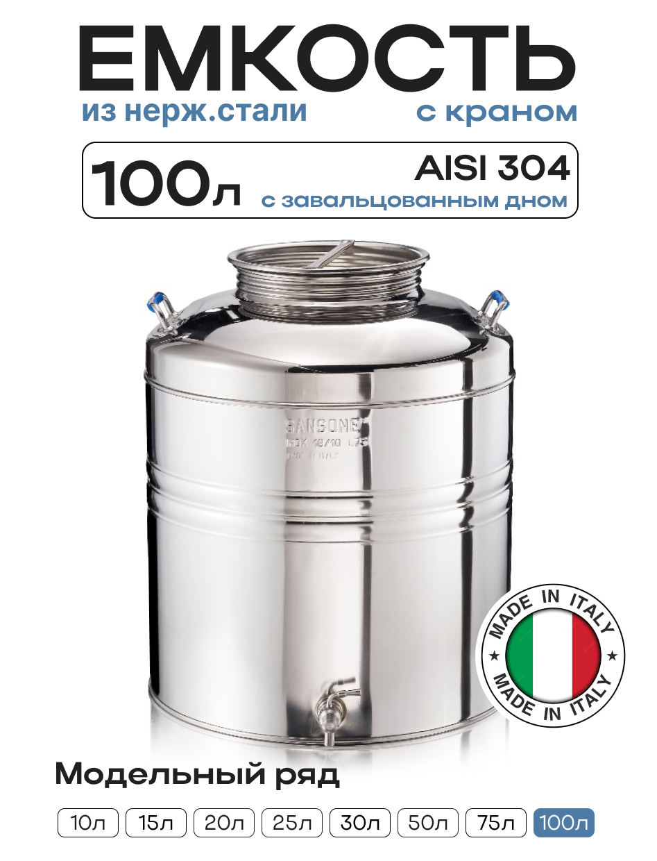 Пищевая бочка из нержавейки, 100 л, с крышкой, краном, завальцованным дном