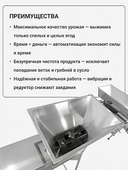 • Сбалансированная работа гребнеотделителя позволяет качественно отделить кисточку, не повреждая ягоду, так как лопасти отделяющего шнека сделаны из силикона, а так же предотвращает попадания гребней в сусло, что благоприятно отразится на конечном продукте.