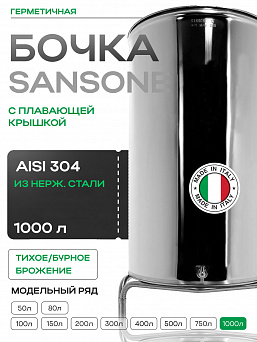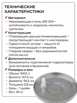Емкость с пылезащитной и пневматической (плавающей) крышкой из пищевой нержавеющей стали. Подходит для бурного брожения (первичное), для тихого брожения (вторичное) и для длительного хранения (созревания продукта).