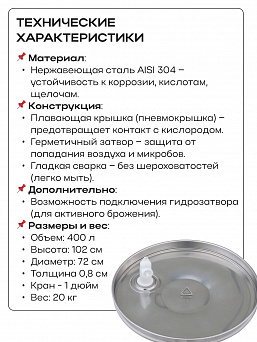Емкость с пылезащитной и пневматической (плавающей) крышкой из пищевой нержавеющей стали. Подходит для бурного брожения (первичное), для тихого брожения (вторичное) и для длительного хранения (созревания продукта).