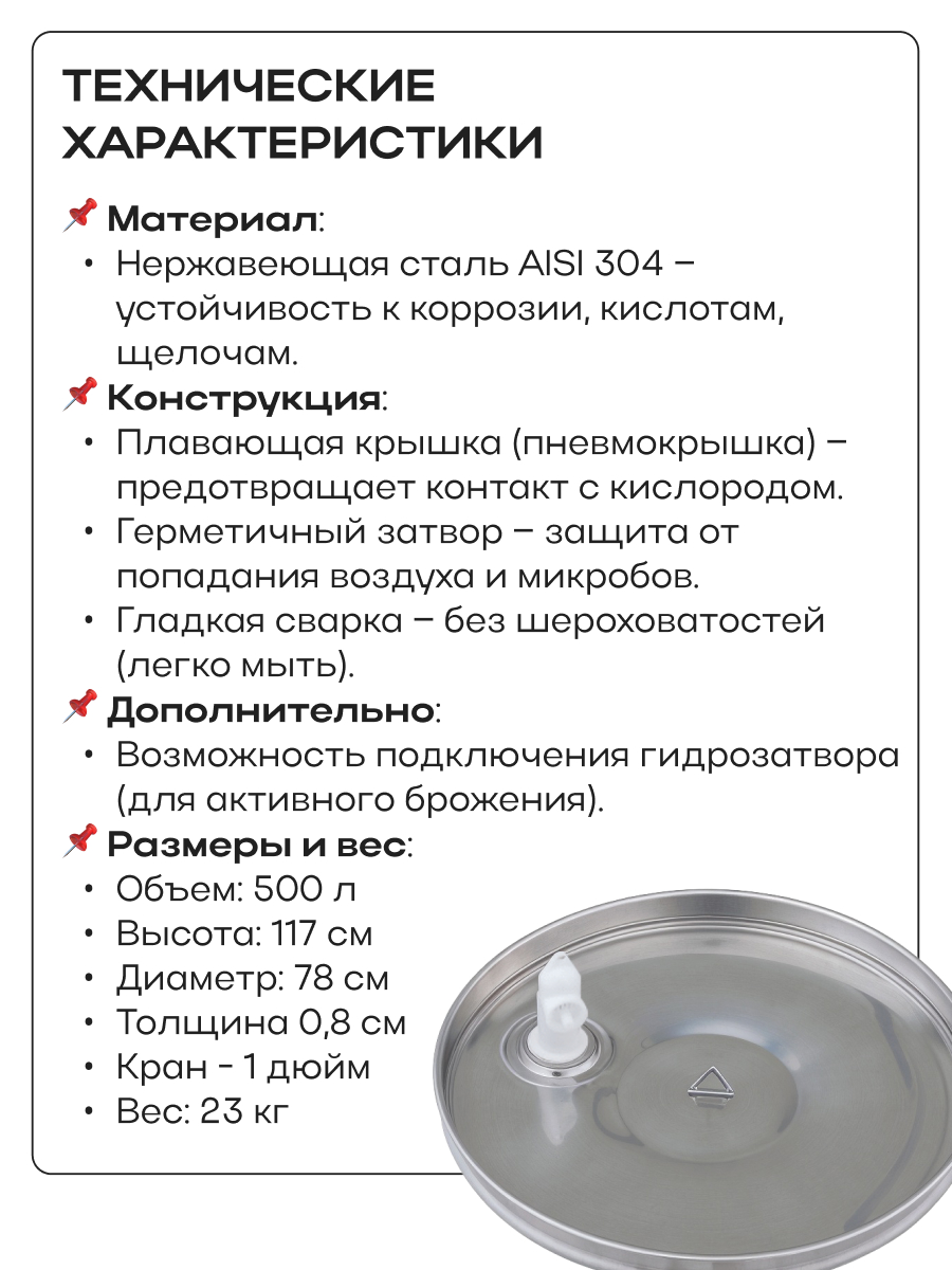Емкость с пылезащитной и пневматической (плавающей) крышкой из пищевой нержавеющей стали. Подходит для бурного брожения (первичное), для тихого брожения (вторичное) и для длительного хранения (созревания продукта).